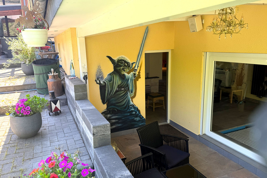 Eine Außenwand kann mit Graffiti einen neuen Glanzpunkt in der Umgebung setzen. Die Wand wird durch Kunst zu einem echten Hingucker und wertet das Umfeld nachhaltig auf.