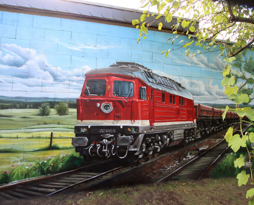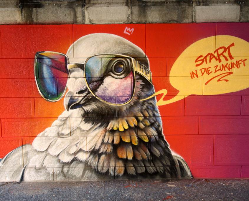 Eine Außenwand kann mit Graffiti einen neuen Glanzpunkt in der Umgebung setzen. Die Wand wird durch Kunst zu einem echten Hingucker und wertet das Umfeld nachhaltig auf.